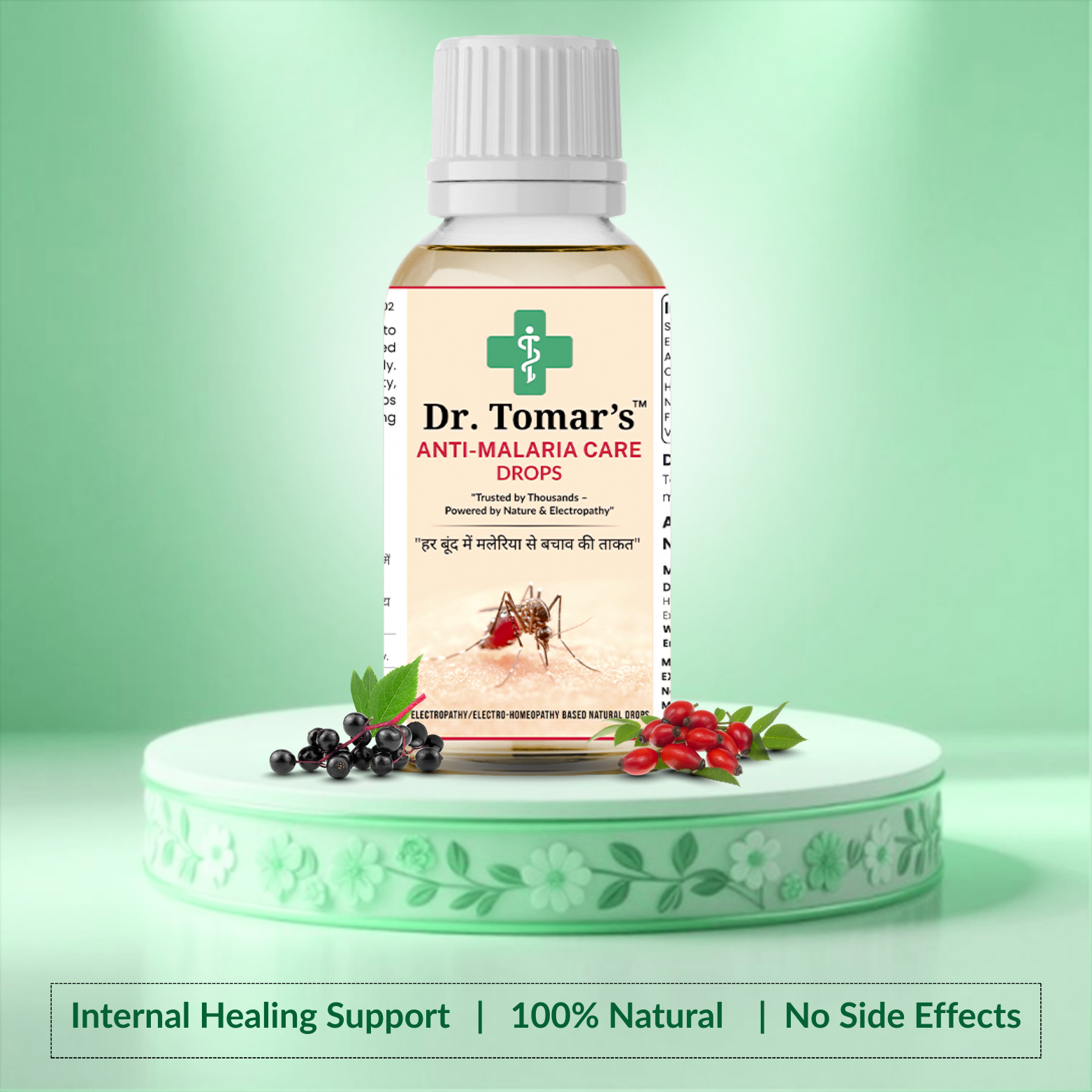 Dr. Tomar’s Anti Malaria Care Drops are a natural electro-homeopathy formulation designed to support fast and safe malaria relief. With immunity-boosting, fever-calming, and blood-strengthening herbal ingredients, these drops work internally to reduce high fever phases, body pain, chills, and weakness